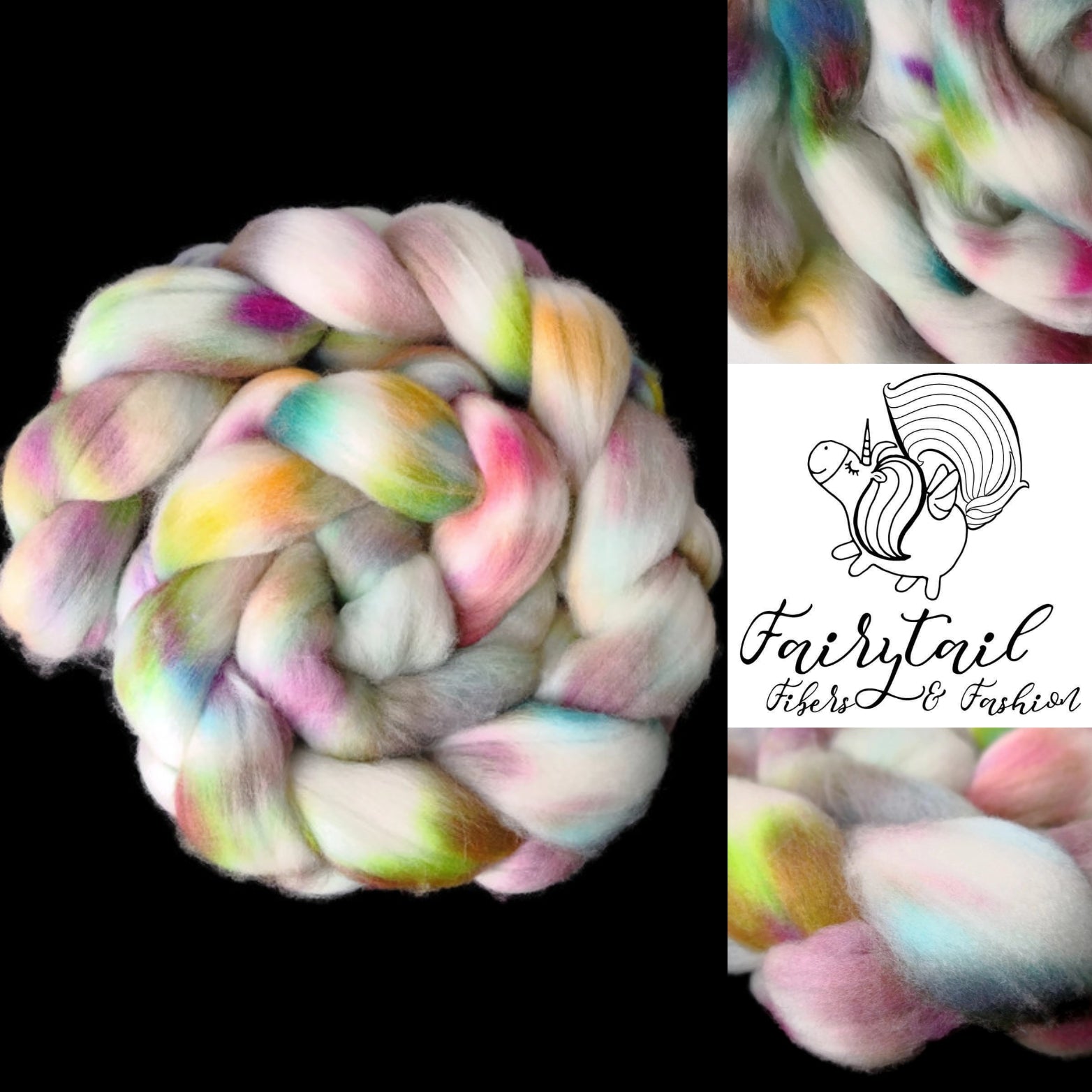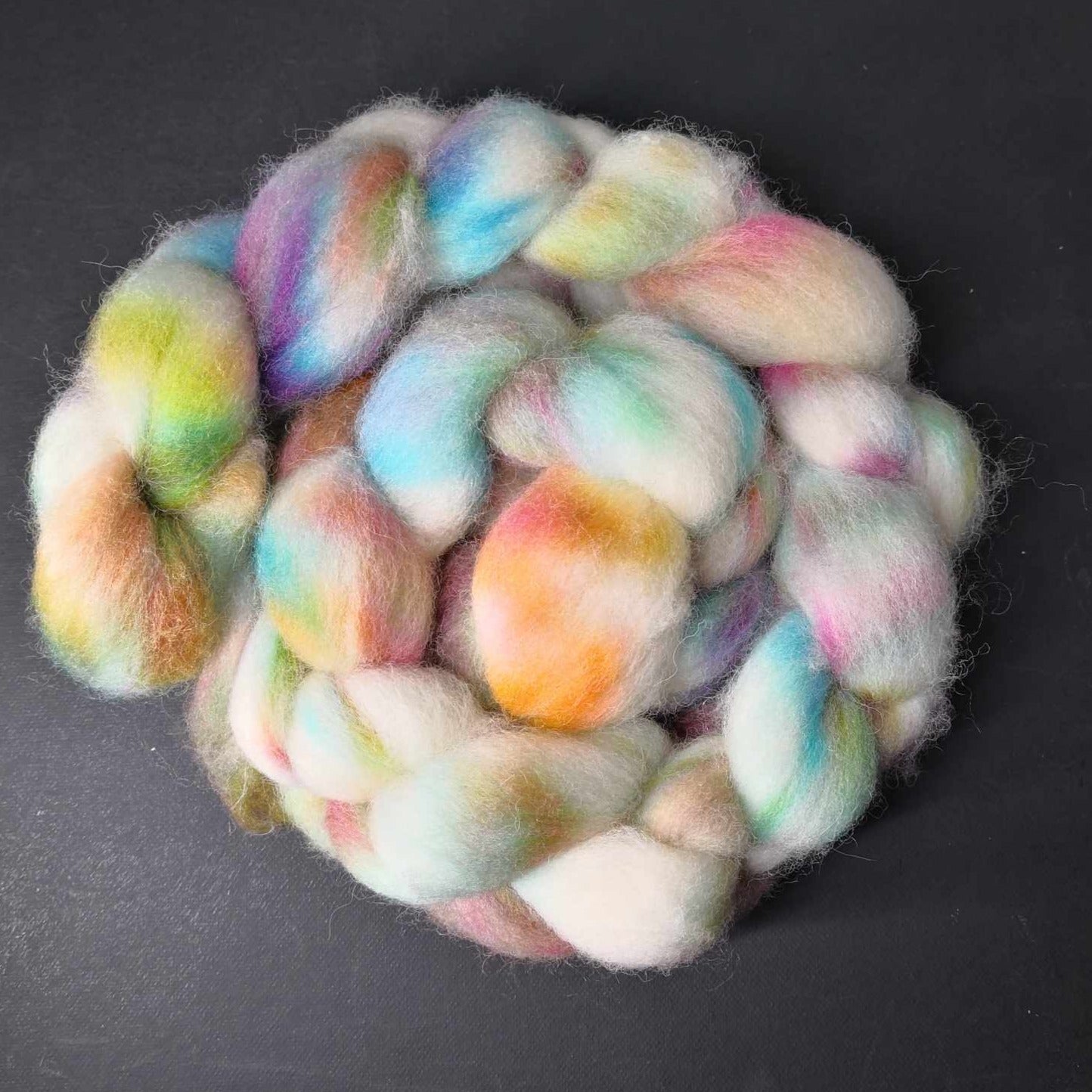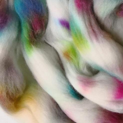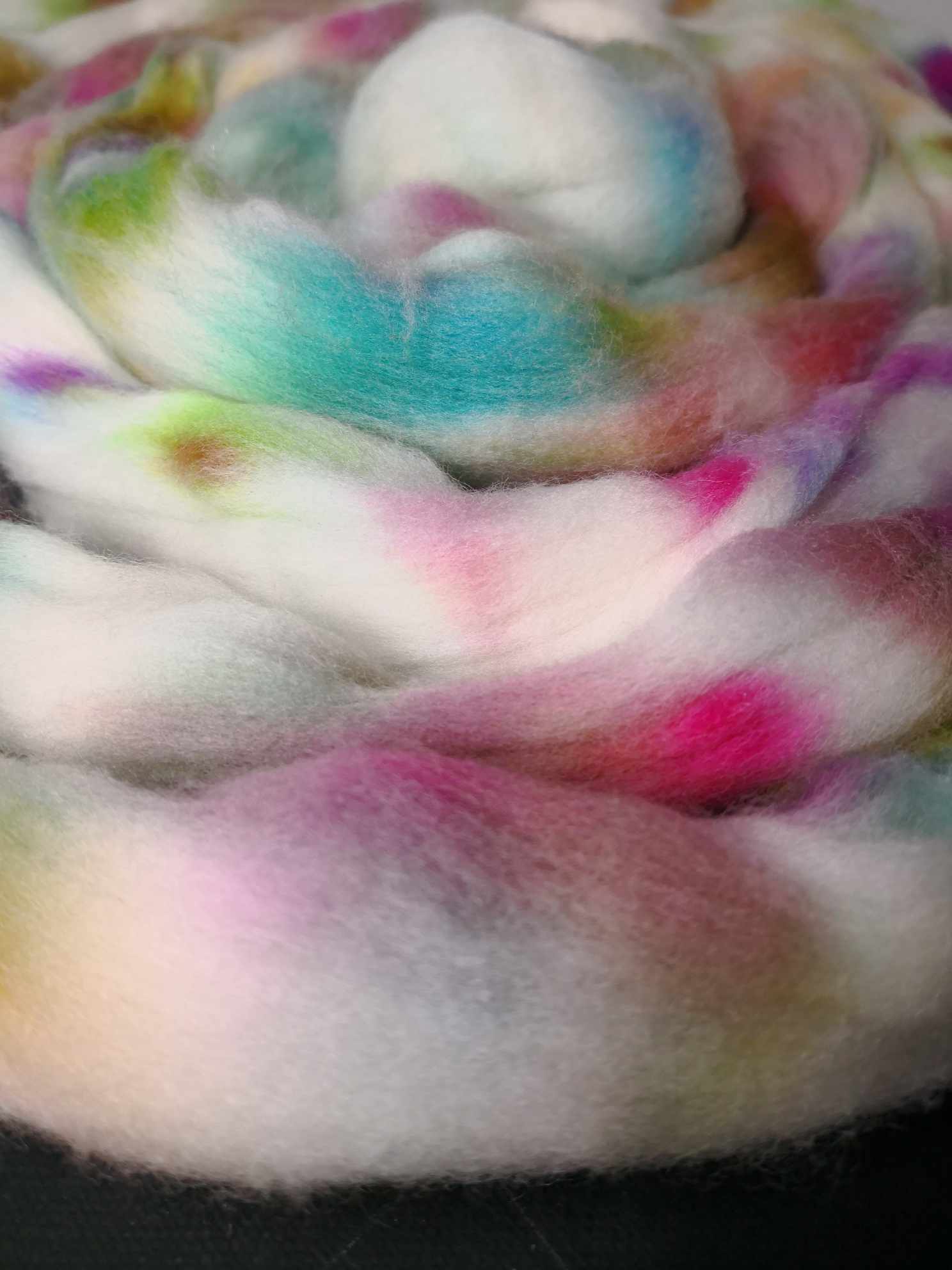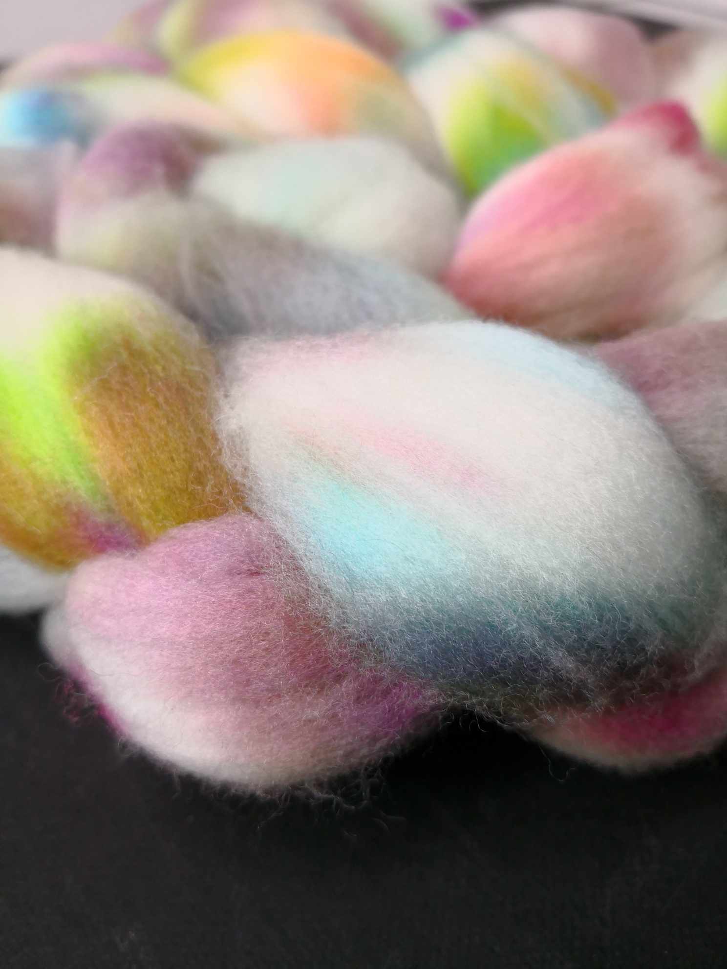 Spinwol in wit grijs, en de totale chaos van alle kleuren door elkaar. Deze lontwol spint heerlijk en makkelijk. We verven de spinvezels in de kleuren van de chaos van Carnaval. Denk aan de confetti op de grond. Alle denkbare kleuren in stippen op één lont spinwol. Alle lonten zijn totaal anders en passen allemaal ook weer heel goed bij elkaar.