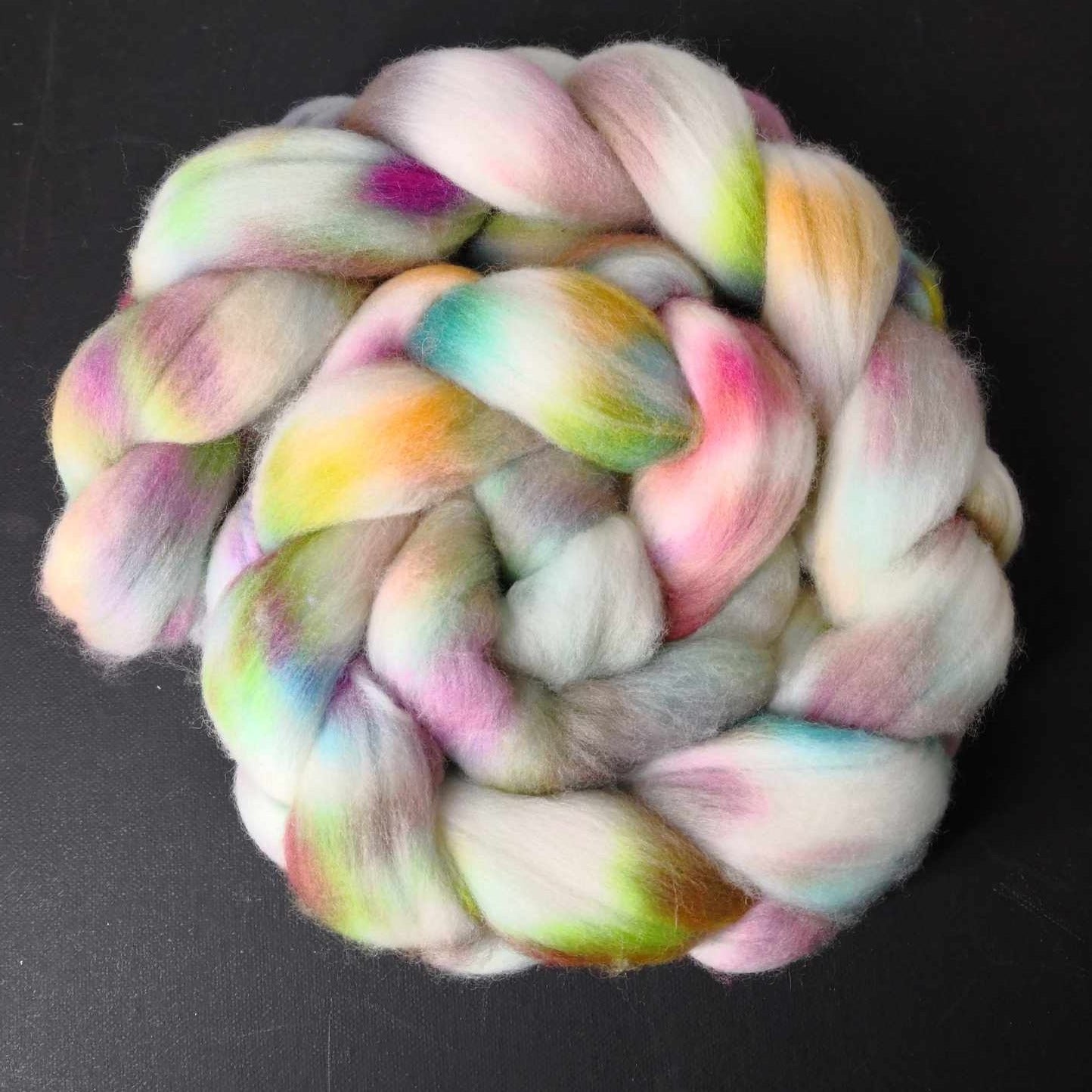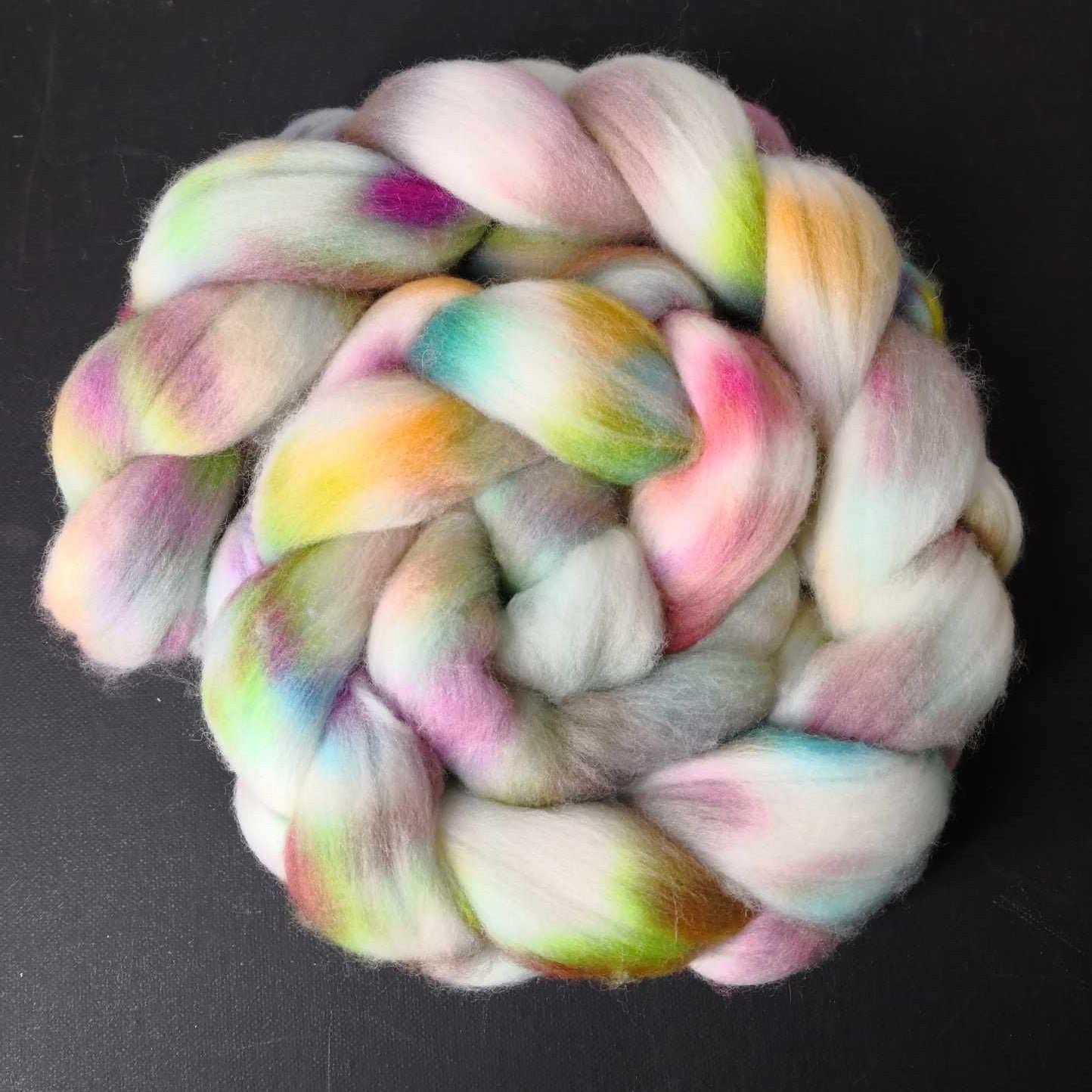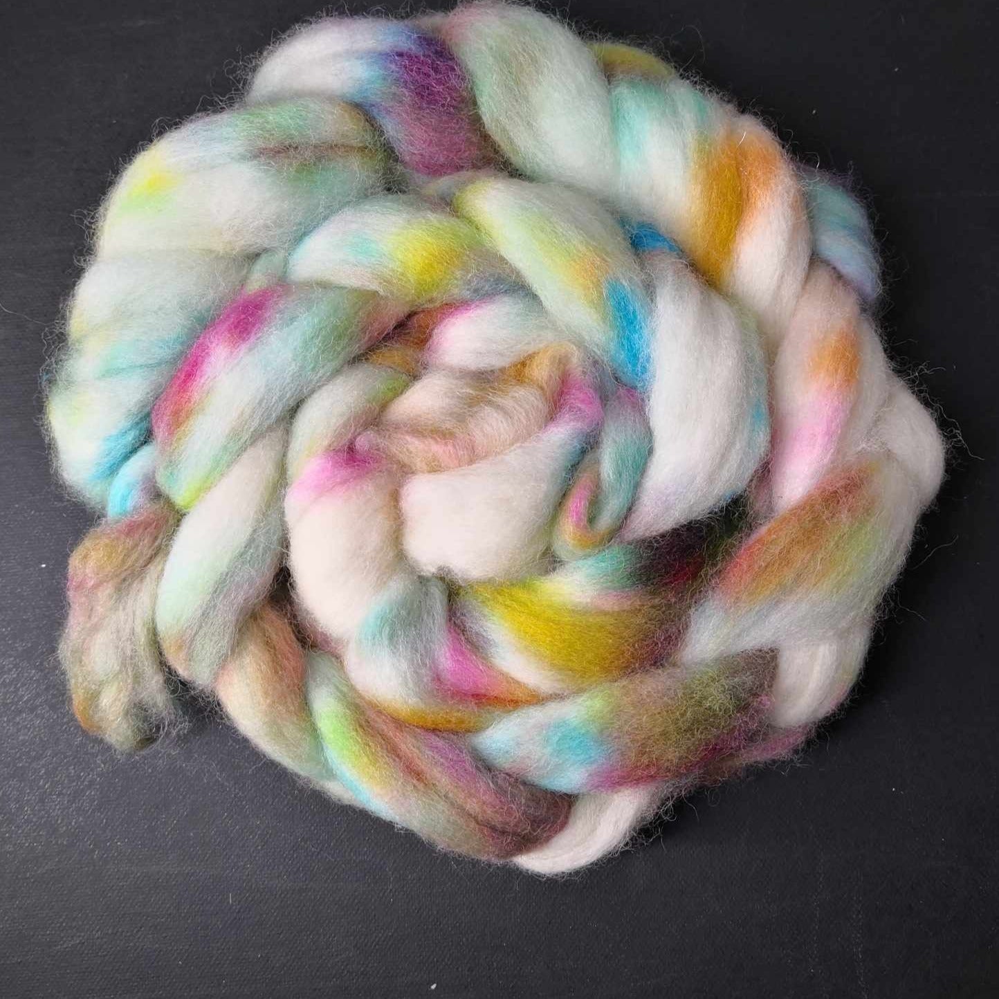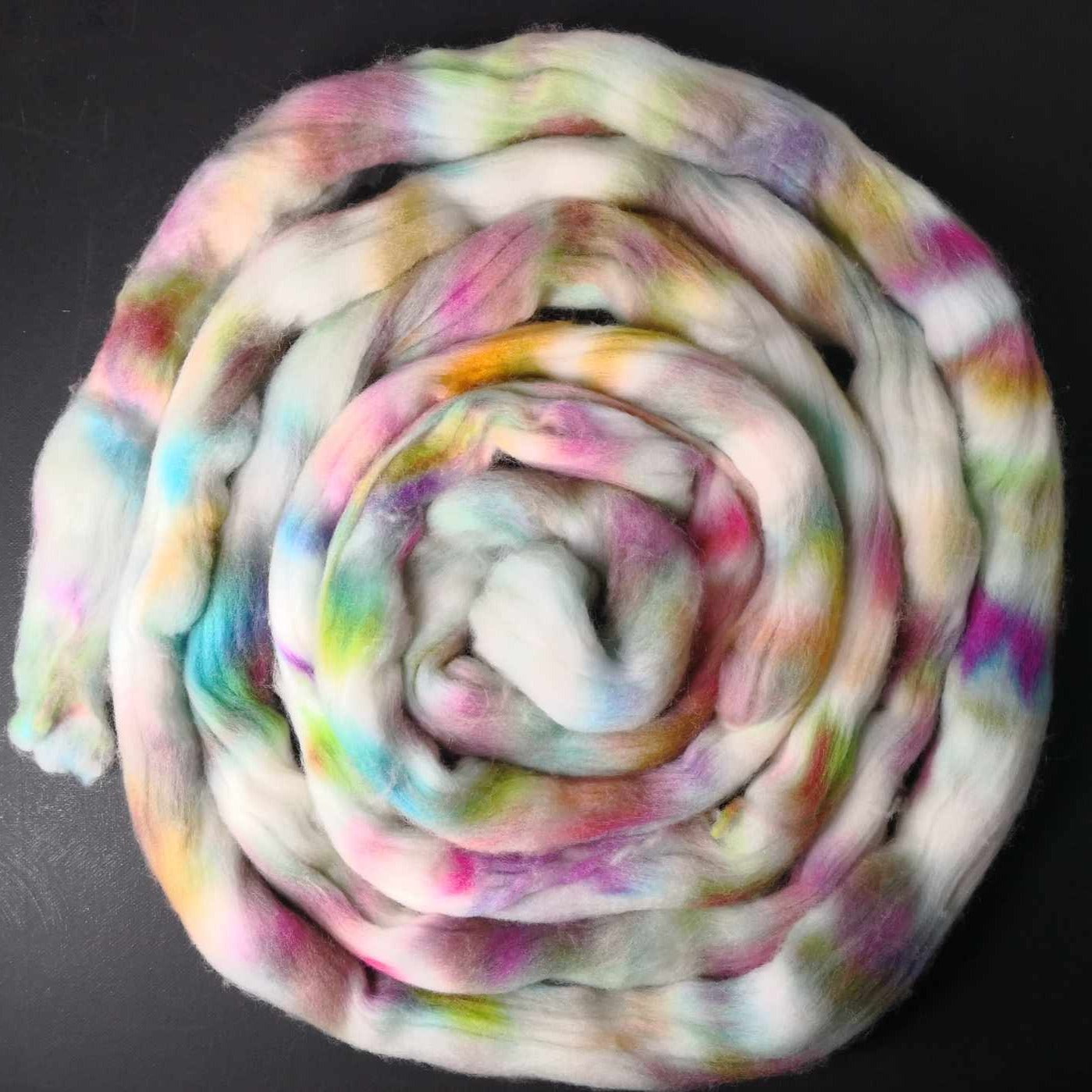 Spinwol in wit grijs, en de totale chaos van alle kleuren door elkaar. Deze lontwol spint heerlijk en makkelijk. We verven de spinvezels in de kleuren van de chaos van Carnaval. Denk aan de confetti op de grond. Alle denkbare kleuren in stippen op één lont spinwol. Alle lonten zijn totaal anders en passen allemaal ook weer heel goed bij elkaar.