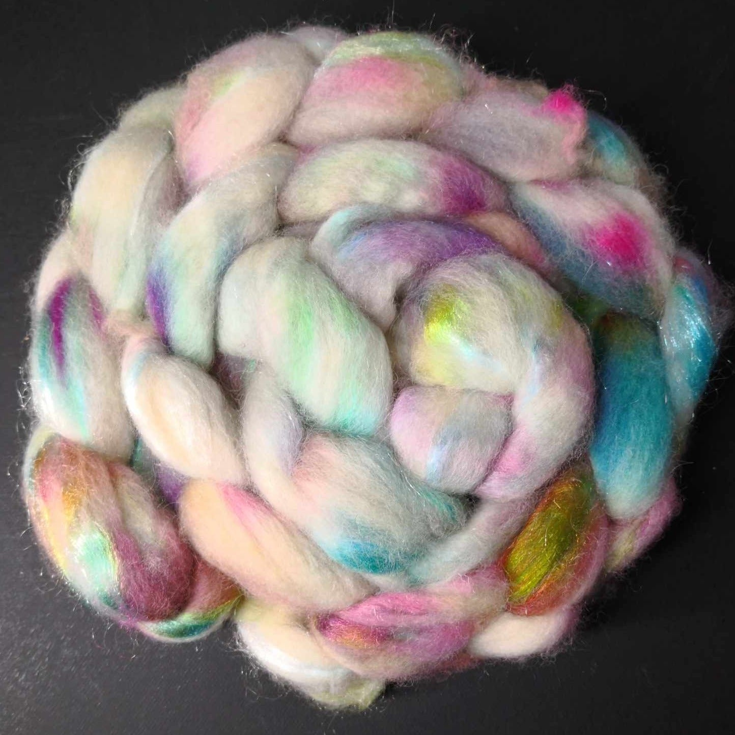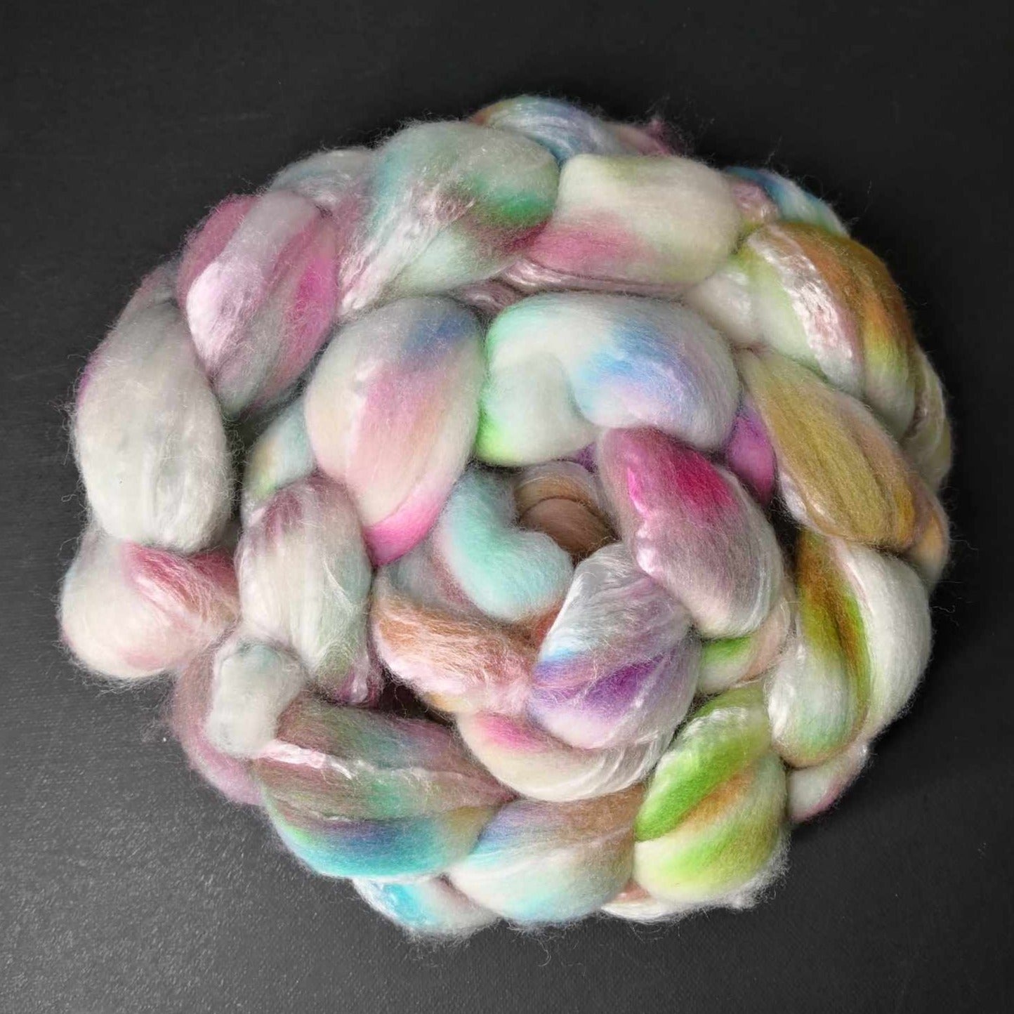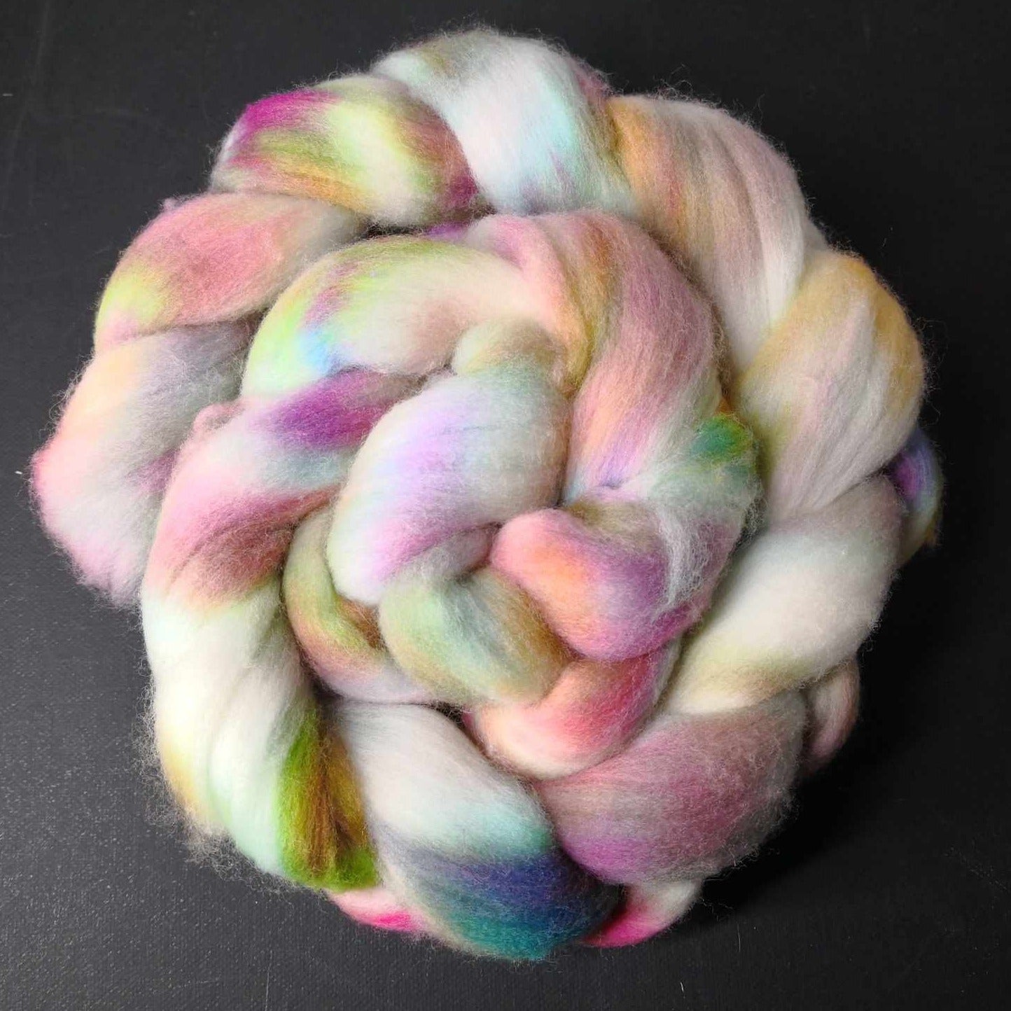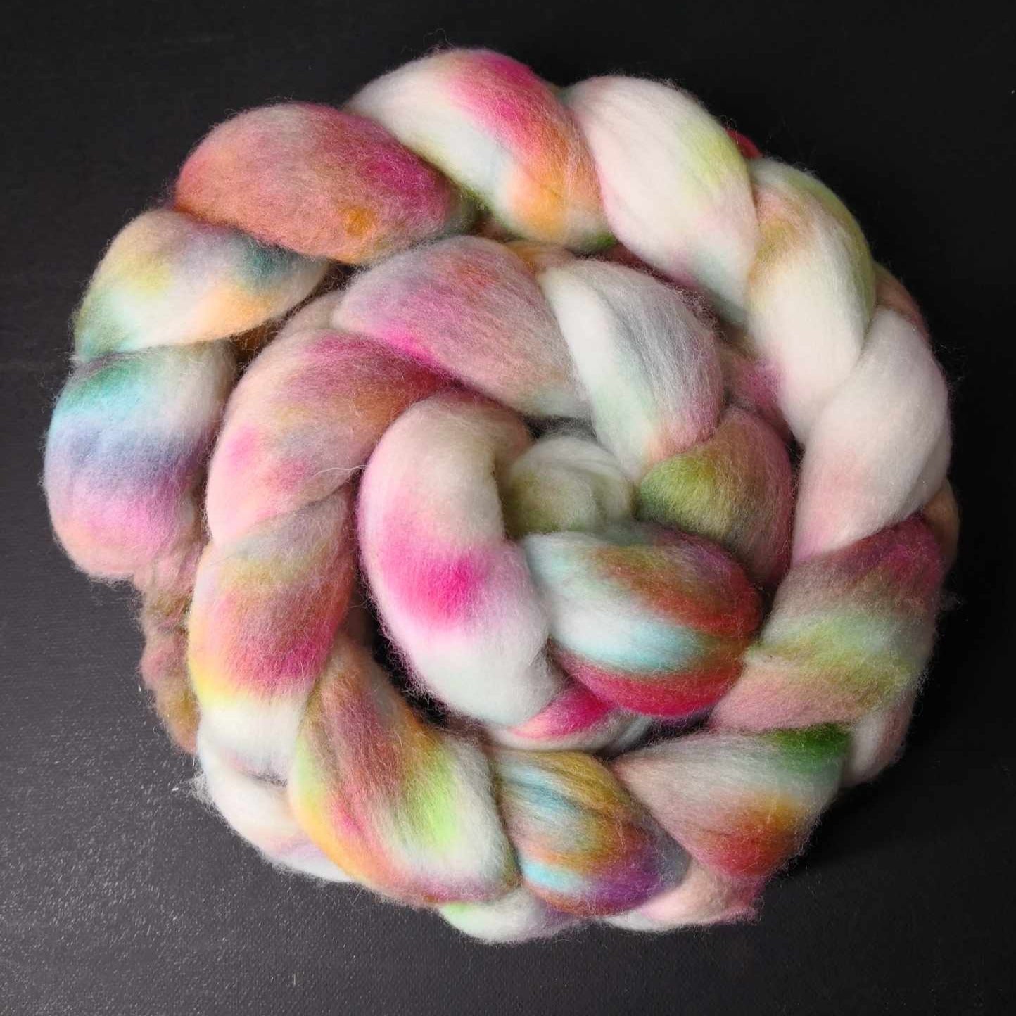 Spinwol in wit grijs, en de totale chaos van alle kleuren door elkaar. Deze lontwol spint heerlijk en makkelijk. We verven de spinvezels in de kleuren van de chaos van Carnaval. Denk aan de confetti op de grond. Alle denkbare kleuren in stippen op één lont spinwol. Alle lonten zijn totaal anders en passen allemaal ook weer heel goed bij elkaar.