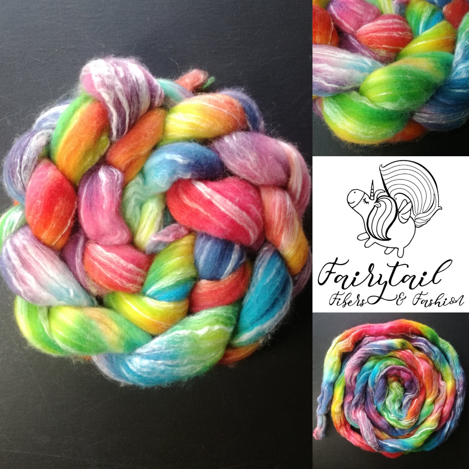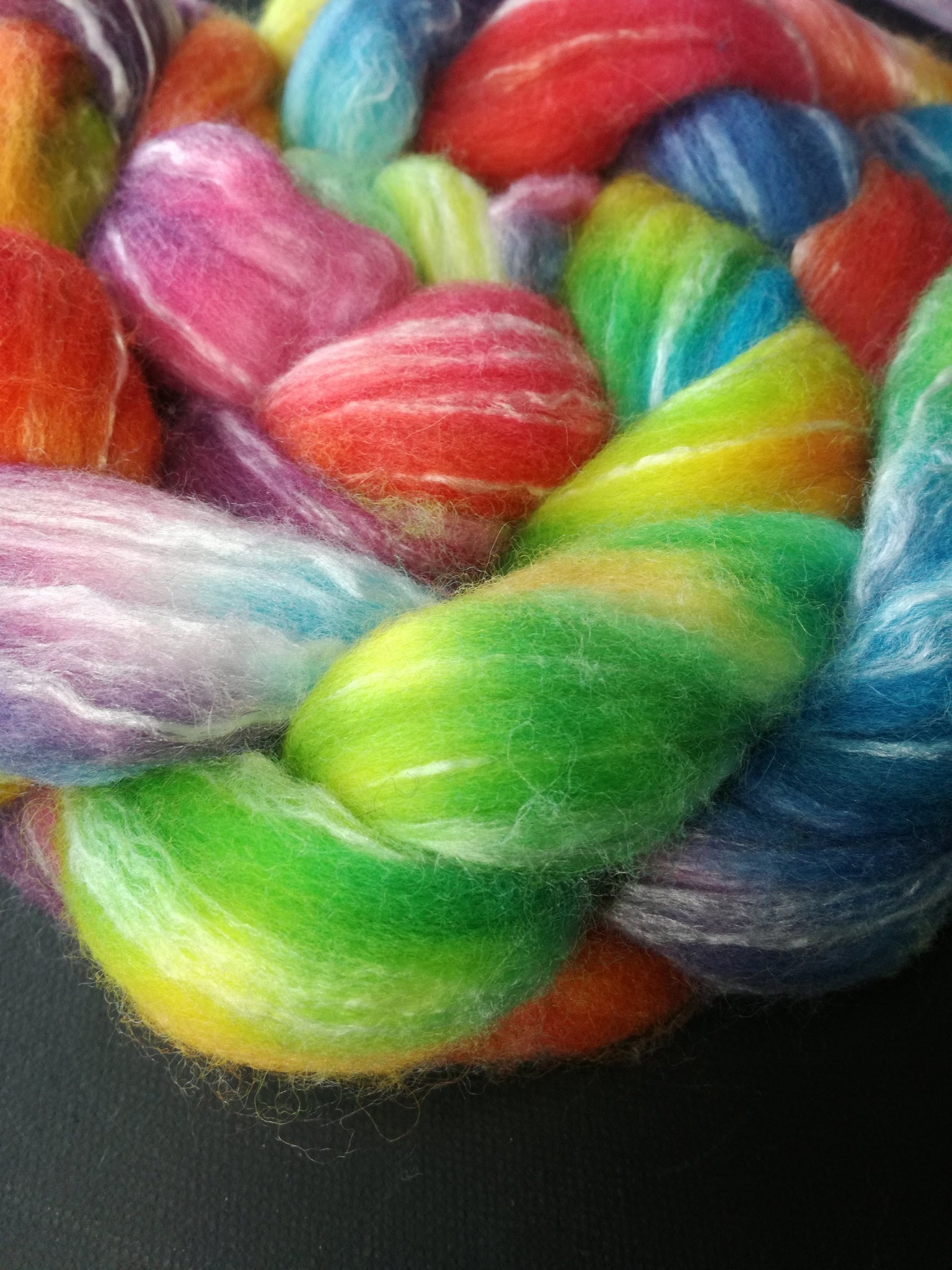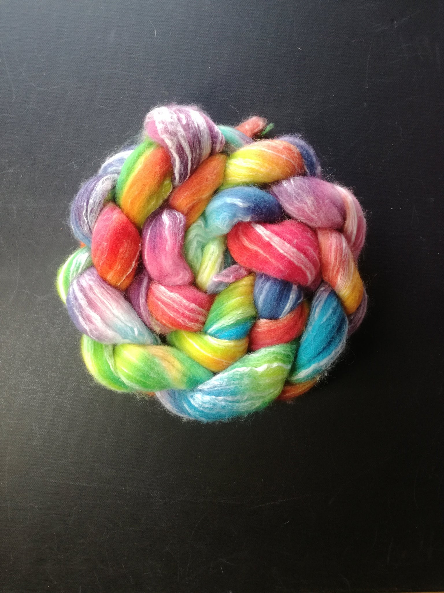 This color can be ordered any time. This is part of our fixed collection. The combed top roving is dyed with the colours of the Rainbow, on repeat. The colours will keep on amazing you when this braid is spun up.