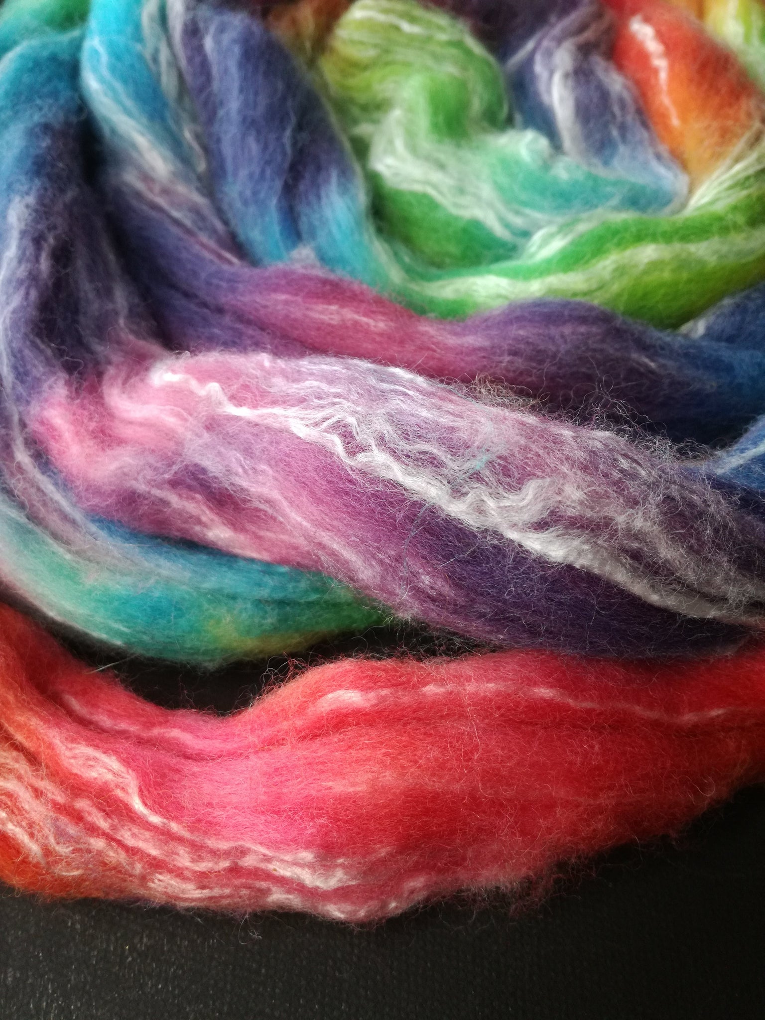 Spectrum is the result of a lot of trial and error. Very difficult to dye. The Roving has at least 10 repeats of the rainbow. It is dyed only using 3 colours. The process is hard to controll.