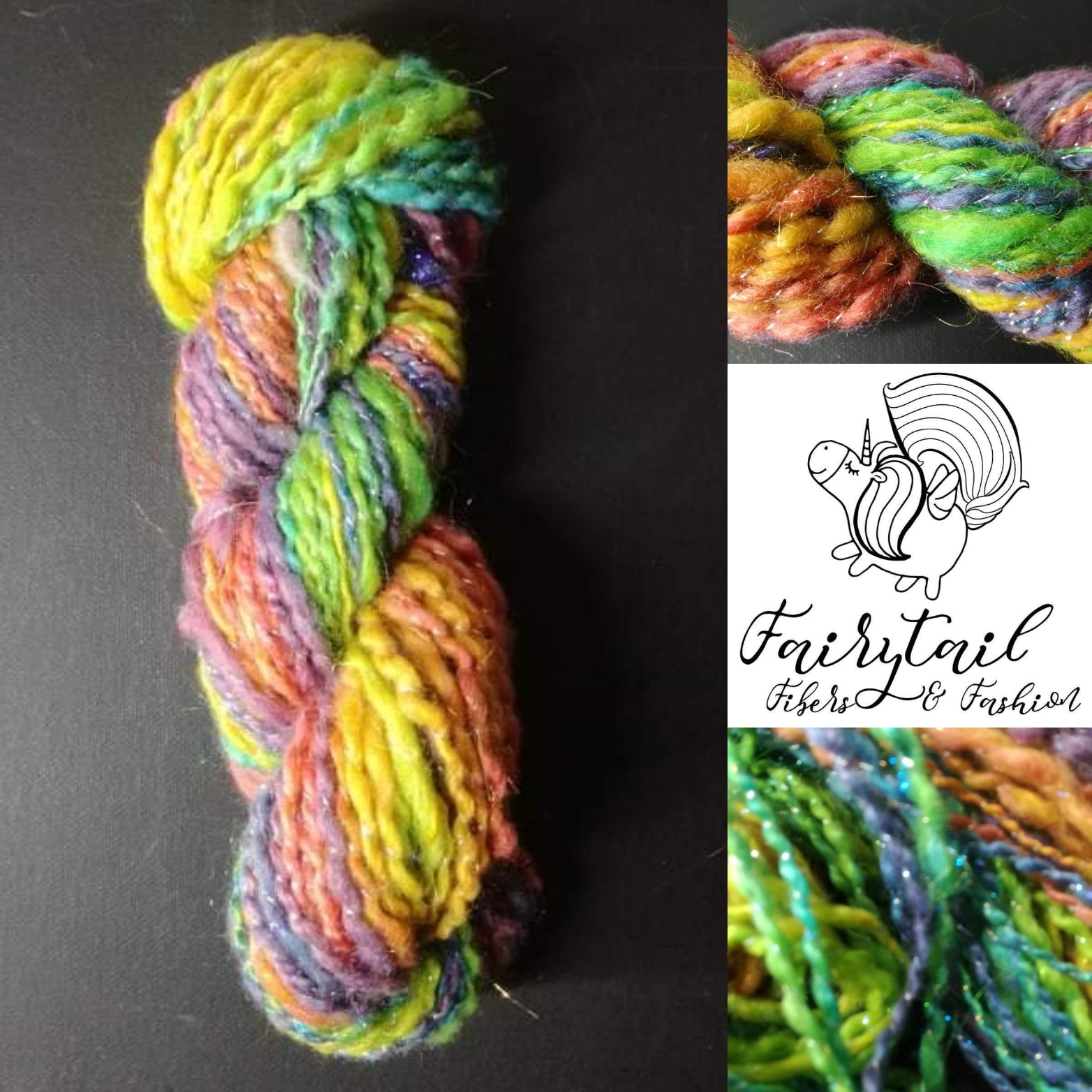 Zelf leren spinnen? Dat kan ook. Het recept voor dit garen is nu beschikbaar.  Of, nog handiger: bestel het hele pakket: DIY Yarn Pack 'Rainbow Glitter Single'