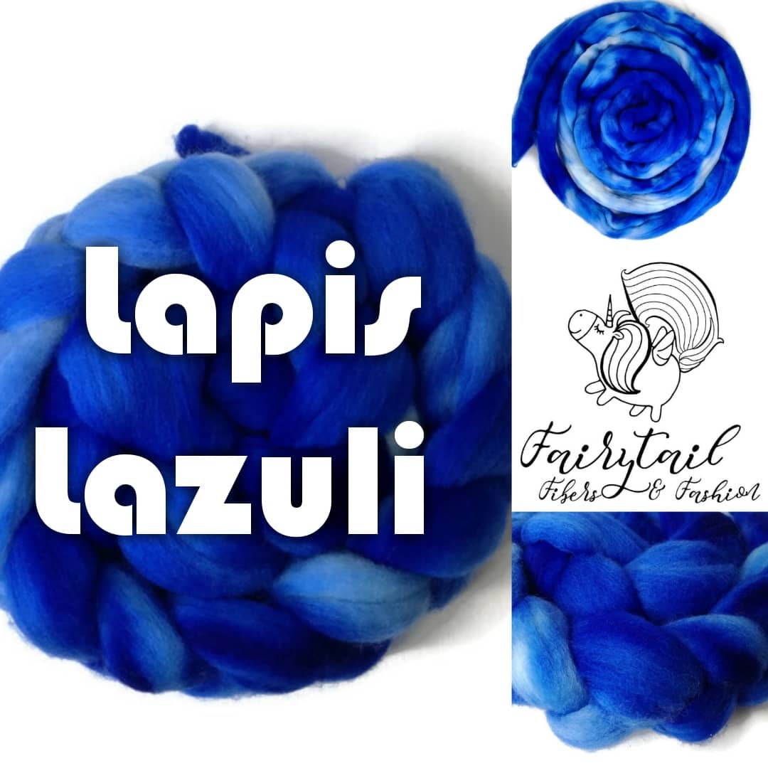 Kobalt blauwe Spinwol, geverfd zoals een echte Lapis Lazuli steen. Deze lontwol spint heerlijk en makkelijk. We verven de spinvezels in de kleuren van de edelsteen Lapis Lazuli. Wit, Fel kobalt blauw en lichter kobalt blauwe wol in één lont spinwol.