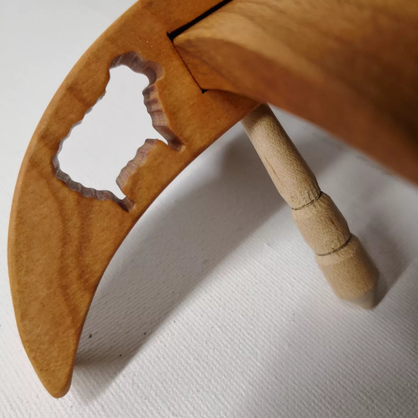 Deze tol is gemaakt van kersenhout. En het stokje is gemaakt van Esdoorn. Stokje is trouwens 20,3 cm lang.